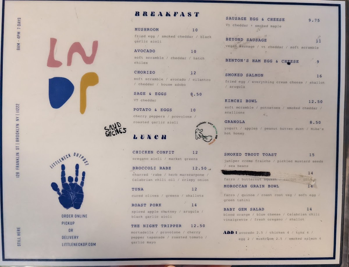 Located at 128 Franklin St in Brooklyn, NY, Littleneck Outpost is not just another eatery; it's a culinary oasis that excels in reimagining the traditional lunch experience. This branch of comfort and creativity shines through its diverse menu, seamlessly blending wholesome ingredients and innovative presentations.